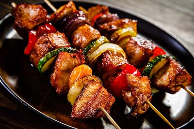 Lightly oil the grill grate. Grill skewers for 10 minutes, turning as needed, or until meat is cooked through and vegetables are tender.